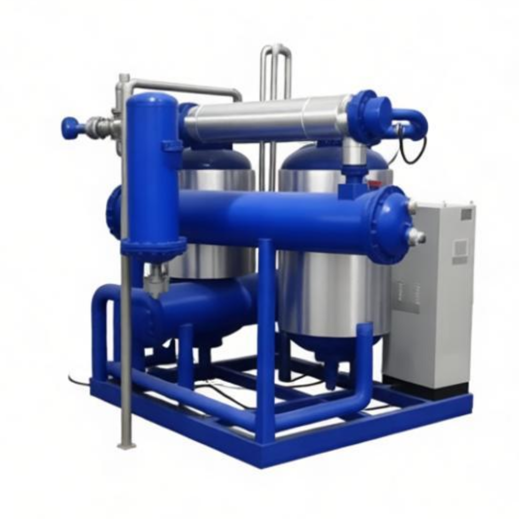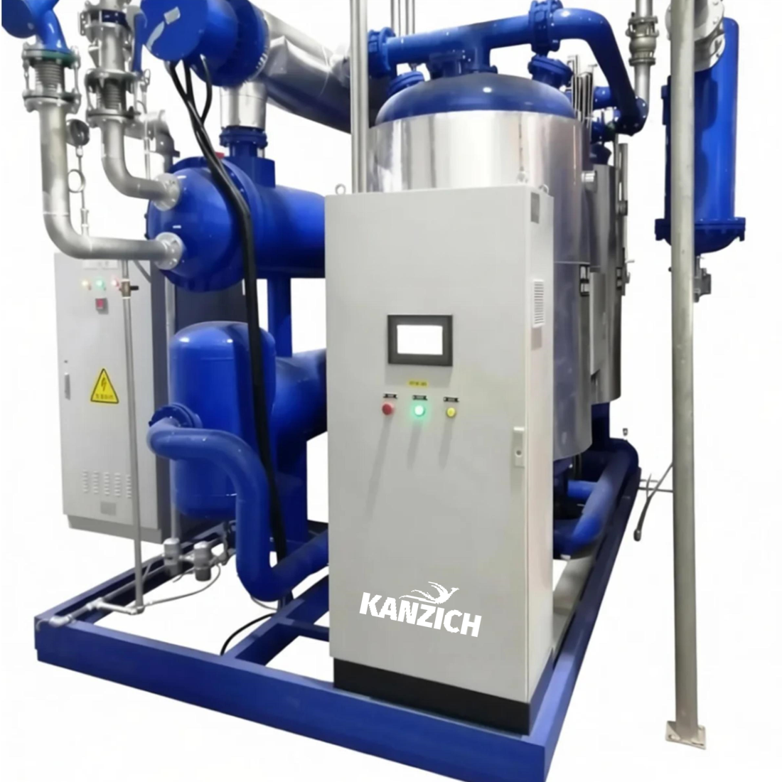 When compressed air contains a lot of heat, in most purification systems, this heat is cooled through a cooler. The air is then dried by a dryer after the temperature is reduced to achieve the required dew point. When using a traditional adsorption dryer, in order to achieve the required dew point, it is necessary to consume about 15% of the regeneration air volume for regeneration. However, the compressed regeneration dryer makes full use of the heat of the uncooled compressed air to regenerate the adsorbent, so on average, only 1% of the air volume of the treated air is needed to blow cold air to the adsorbent, which can achieve continuous drying.